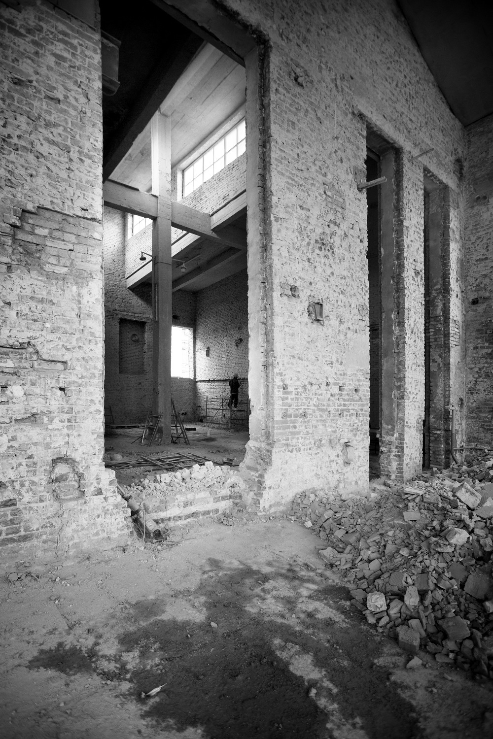 Разобравшись с полом, перешли к стенам, и здесь нас тоже ждал сюрприз. Когда мы сбили старую штукатурку, выяснилось, что одна часть здания не просто была построена намного раньше, а в принципе являлась отдельно стоящим зданием. Говорят, что в 1940-е годы здание уже стояло, и только в 1967 году к нему пристроили дополнительный объем, так что одна из фасадных стен стала внутренней перегородкой, объединяющей обе части. Оконные проемы фасадной стены заложили, оштукатурили и покрасили. Соответственно, возник вопрос, что делать с кирпичом. Смотрелся он неорганично и, конечно, кладку надо было разбирать. Мы выбили проемы окончательно, чем визуально объединили помещения. Эффект превзошел ожидания: семиметровые проемы во внутренней стене добавили пространству торжественности. Оконные проемы фасадных стен около 6 метров высотой тоже причинили нам много хлопот: сложность изготовления, внушительный бюджет на производство… Зато — это были те самые окна из нашего утопического списка.